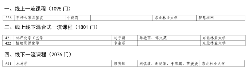 其中木质新型材料教育部工程研究中心牛晓霆教授主讲的《明清古家具鉴赏》光荣入选国家级线上一流本科课程,刘守新教授主讲的《林产化学工艺学》、李淑君教授主讲的《植物资源化学》光荣入选国家级线上线下混合式一流本科课程,郭明辉教授主讲的《木材学》光荣入选国家级线下一流本科课程。