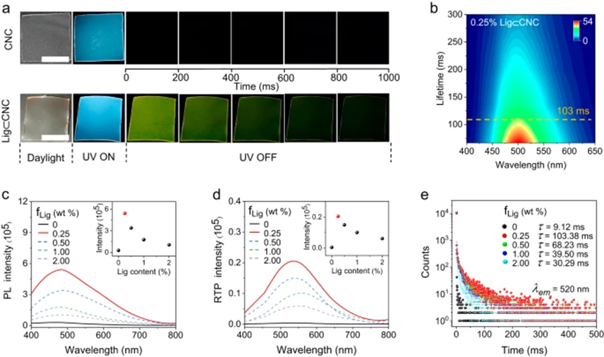 如图2所示,将CNC与木质素磺酸盐(0.25 wt%)结合并在365 nm激发后,与未改性的CNC薄膜相比,显示出的发光和RTP强度分别高出约20倍和57倍(图2c, d),且RTP寿命显著延长。经过严谨的分析,作者认为结果磺酸盐木质素和CNC之间可能存在氢键,限制了磺酸盐木质素的分子振动并增强了RTP发射。