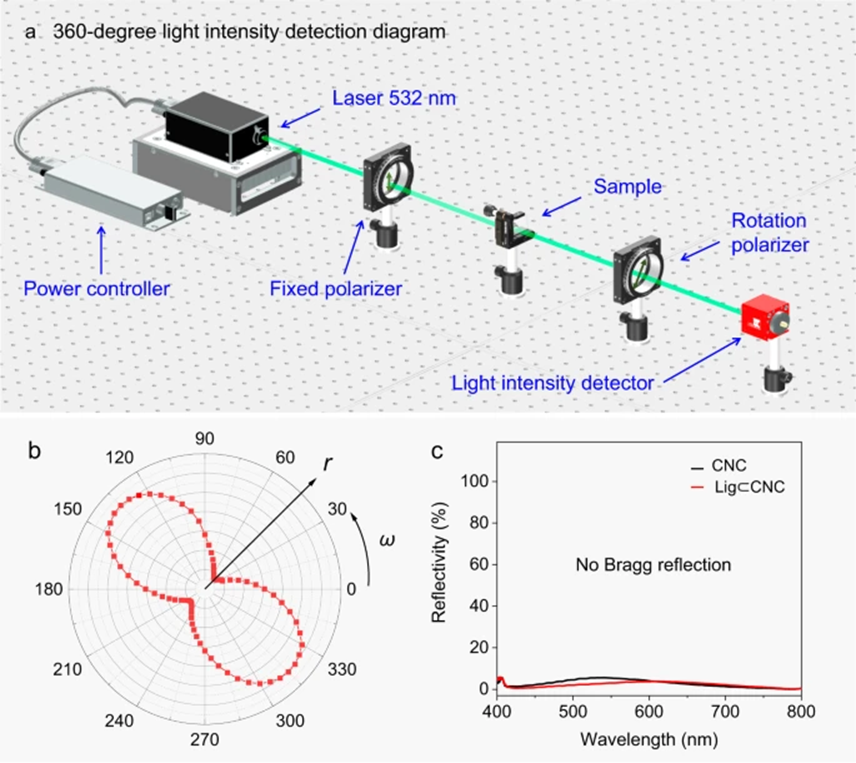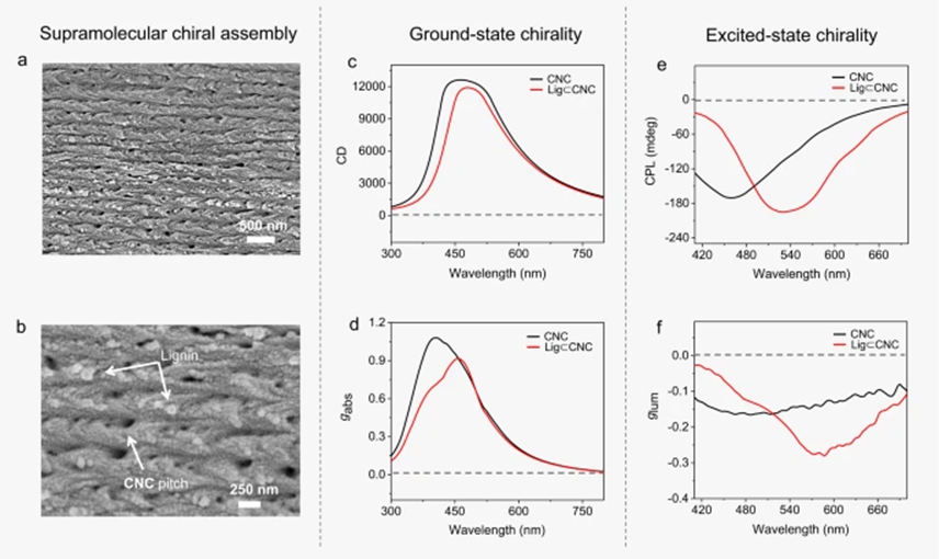 图3. 由CNC和共组装的Lig⊂CNC制作的薄膜的手性光学特性。
