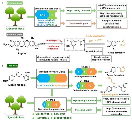 此次,该团队的优秀青年学者刘永壮副教授,针对解聚转化过程中易出现的木质素缩合、在纤维素表面吸附性聚集等影响产物利用效率和价值链的问题,提出构建功能可调型双氢键供体低共熔溶剂的研究思路,通过氯化胆碱/草酸/乙二醇的科学配置以及计算分析它们与木质组分之间的构效关系,在不同的路径实现了对木质素的高效解聚、缩合抑制和有效分离,并同时保证了可分离纤维素组分的高纯度和后续转化活性。分离后的木质素经过催化氢解或酸解后能够选择性得到酚类芳香单体,产率提高约5倍,是迄今为止催化解聚低共熔溶剂分离木质素的最高得率;经分离得到98%的纤维素组分,未发现任何木质素的重吸附和沉积,通过酶解转化可实现96%~99%的高葡萄糖产率。文中所采用的新型低共熔溶剂具有成本低廉、绿色无毒的显著优势,且利用后具有较高的回收率和纯度,再次利用依然展现良好的解离效果。综上,该研究工作为林木生物质的可控精炼提供了一种新方法,更向实现林木生物质的理想化综合精炼又迈进一步,在未来的生物精炼产业发展方面具有较大的应用空间。