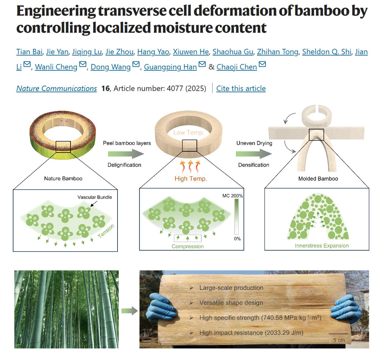 竹子能否像金属和碳纤维那样,被精确塑形并承担高强度结构使命?东北林业大学联合武汉大学给出了肯定答案。该团队基于传统的干燥理论,提出“局部水分梯度驱动的非均匀干燥”策略,实现了竹材横向的细胞可控变形,可将天然圆竹加工成任意三维(3D)结构构件,并在力学性能与碳足迹上同时超越了多种传统工程材料。相关研究以“Engineering transverse cell deformation of bamboo by controlling localized moisture content”为题,发表于《Nature Communications》期刊,东北林业大学博士研究生白天为第一作者,李坚院士、程万里教授、王栋副教授、韩广萍教授及陈朝吉教授为共同通讯作者。