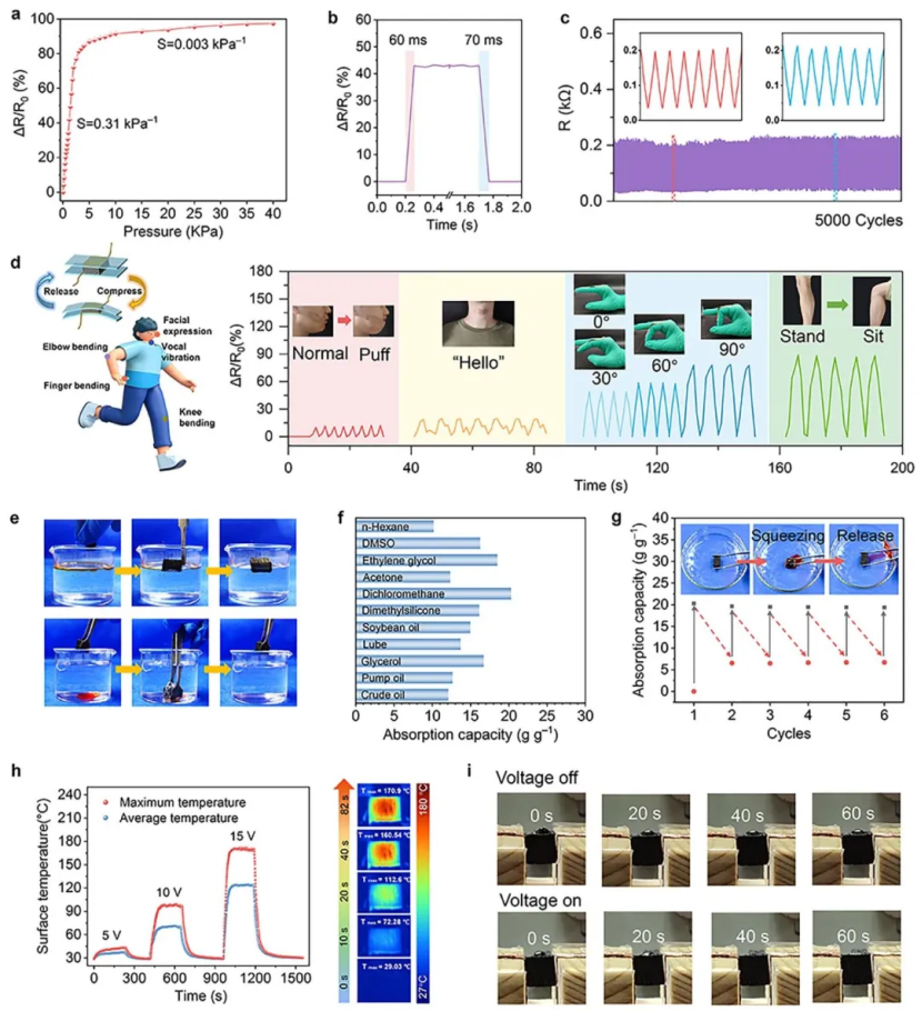 a)压力增加时传感器的ΔR/R 0。b) 响应和恢复时间。c) 传感器在40%应变下的5000次加载-卸载循环期间的电阻响应。d)EWCS作为用于人体生物信号检测的可穿戴压力传感器的相对电阻变化的示意图和实时响应曲线。e) 显示疏水性EWCS在水面上吸收正己烷(染成橙色)和在水中吸收二氯甲烷(染成红色)的照片。f) 疏水性EWCS对各种有机溶剂和油的吸收能力。g) 疏水性EWCS对二氯甲烷的循环吸收能力。h) 疏水性EWCS在不同施加电压下的表面温度变化和红外热成像图像,显示15 V电压下的温度变化。i) 疏水性EWCS在没有电压和10 V电压的情况下吸收原油。