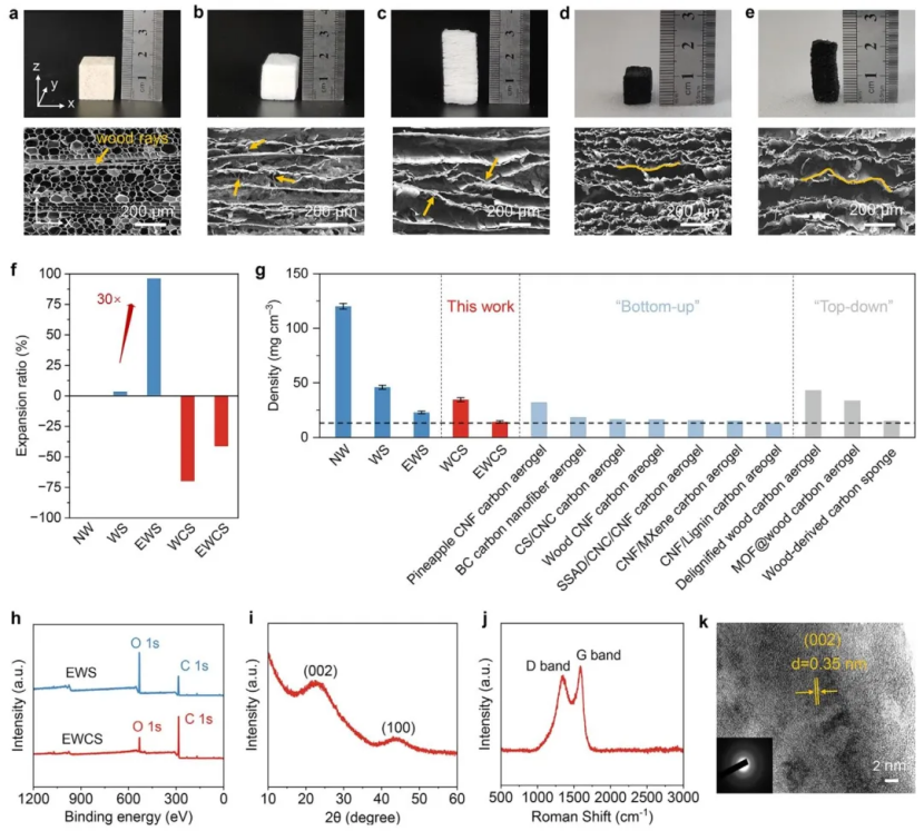 a) NW、b) WS、c) EWS 和 d) WCS 和 e) EWCS 的光学照片和横截面(z-x 平面)SEM 图像。f) 体积膨胀比 (ΔV/V 0 ),V 0 表示 NW 的体积。g) 文献中 NW、WS、EWS、WCS、EWCS 和来自木材或纤维素的碳气凝胶/海绵的密度。h) WS 和 EWS 的 XPS 光谱。i) XRD 图谱,j) 拉曼光谱和 k) EUCS 的高分辨率 TEM 图像。