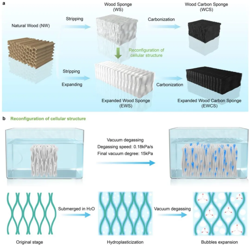 a) 传统木碳海绵和膨胀木碳海绵的制造过程示意图。b) 海绵原位膨胀机理示意图。