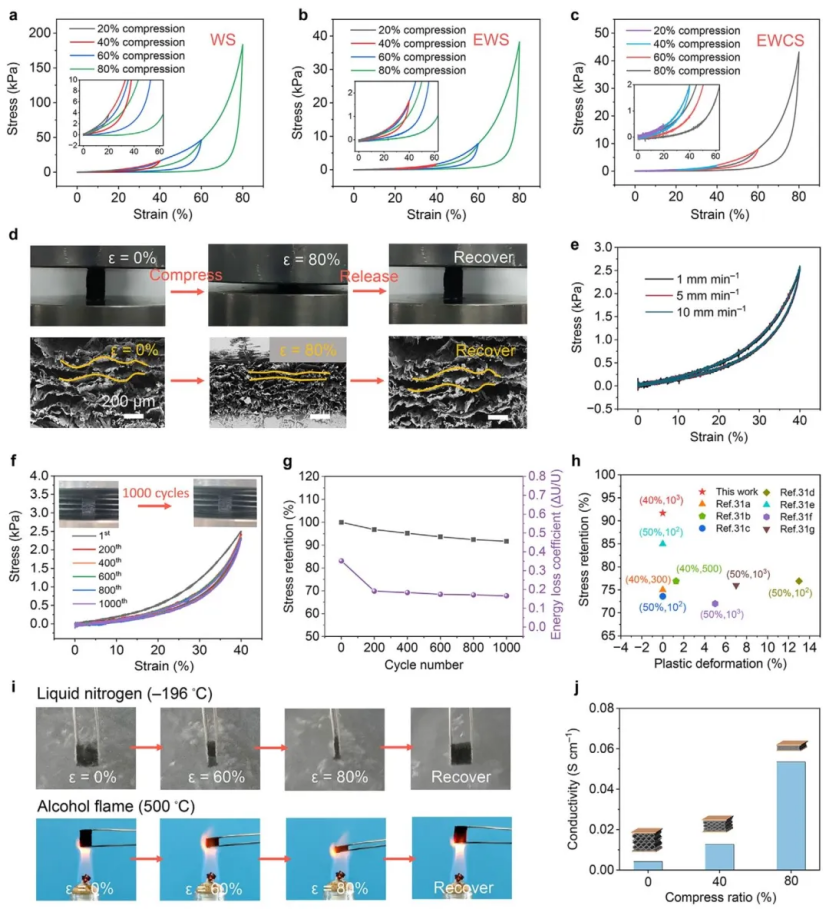 a) WS、b) EWS 和 c) EWCS 不同应变下压缩释放的应力-应变曲线。d) EWCS 的压缩和恢复照片,显示出高压缩性和弹性。e) EWCS 在不同加载速度下压缩-释放的应力-应变曲线。f) 40% 应变下的 1000 次循环的压应力-应变曲线。g) 40% 应变下 EWCS 的应力保持和能量损失系数(1-1000 次循环)。h) 塑性变形和应力保持与其他报道材料的比较。i) EWCS 在液氮和醇火焰中的压缩和回收过程。j) EWCS 在不同压缩应变下的电导率。